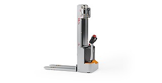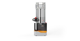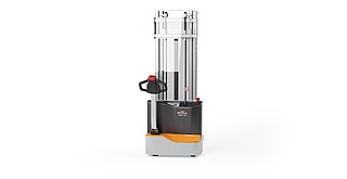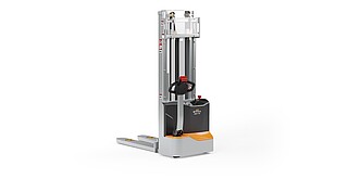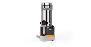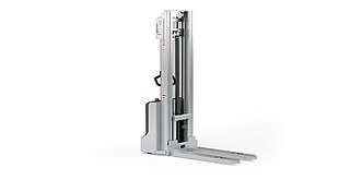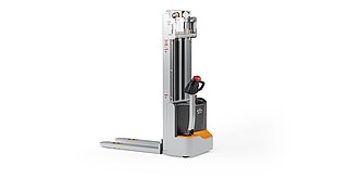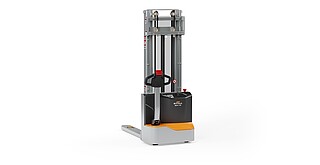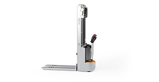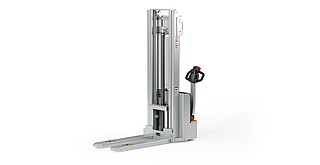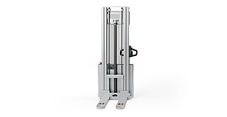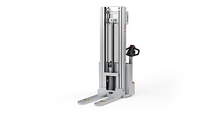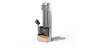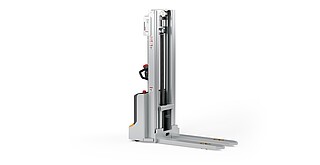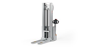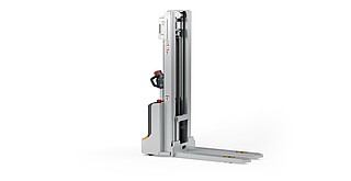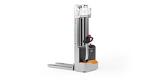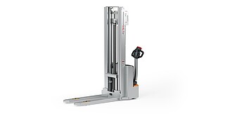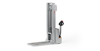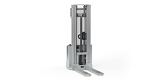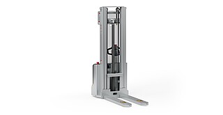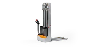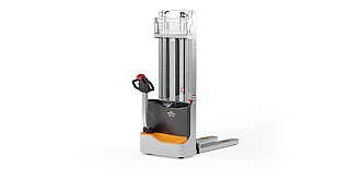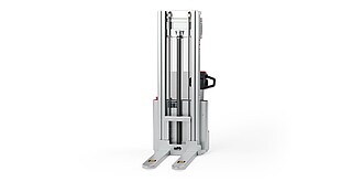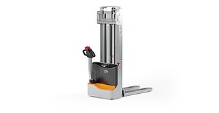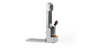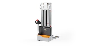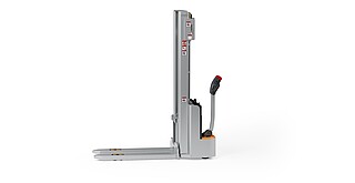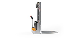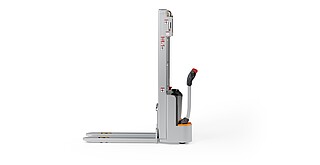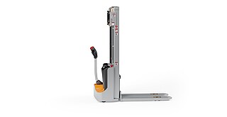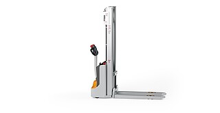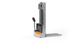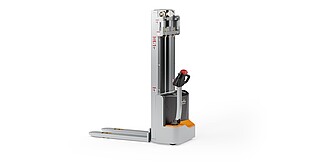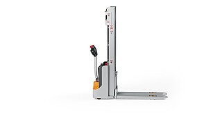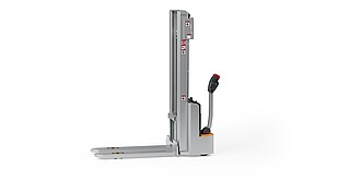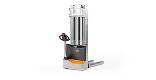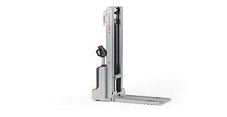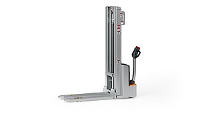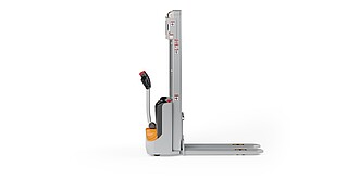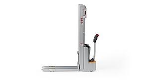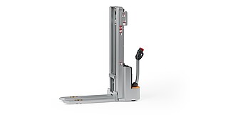 Reaching new heights: With the ECV 10 you can reach a lift height of up to 3,227 mm. Paired with a maximum lifting capacity of up to 1,000 kg, the ECV 10 high lift pallet truck provides ideal support for light and sporadic stacking applications. The compact truck dimensions enable transporting and stacking even in tight working areas and narrow aisles. Two 12 V batteries provide 125 ampere hours for long operating times, and with its built-in charger, the ECV 10 can be recharged at any standard power socket. The LED display shows the current battery charge status and the operating hours, so the operator always has everything in sight. The ECV 10 also performs well in terms of safety. The wide view between the lift profiles allows for an optimum view of the fork tips. In addition, the lowered design of the vehicle frame protects the feet of operators and third parties. The ECV 10 is also equipped with automatic speed reduction based on lift height, to keep you safe when driving. All functions can be operated with equal ease by left- and right-handed operators thanks to the optimised shape of the tiller.